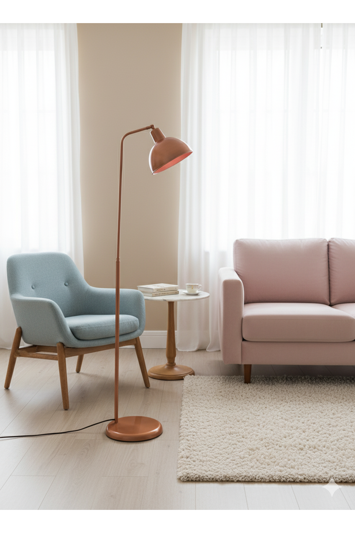 Bu modern lambaderi koltuk kenarına ya da okuma köşenize yerleştirerek ortamda sıcak bir atmosfer oluşturabilirsiniz. Metal gövdesiyle dekorasyona zarif bir renk dokunuşu yapan lambader, mekanınıza stil ve enerji katar.