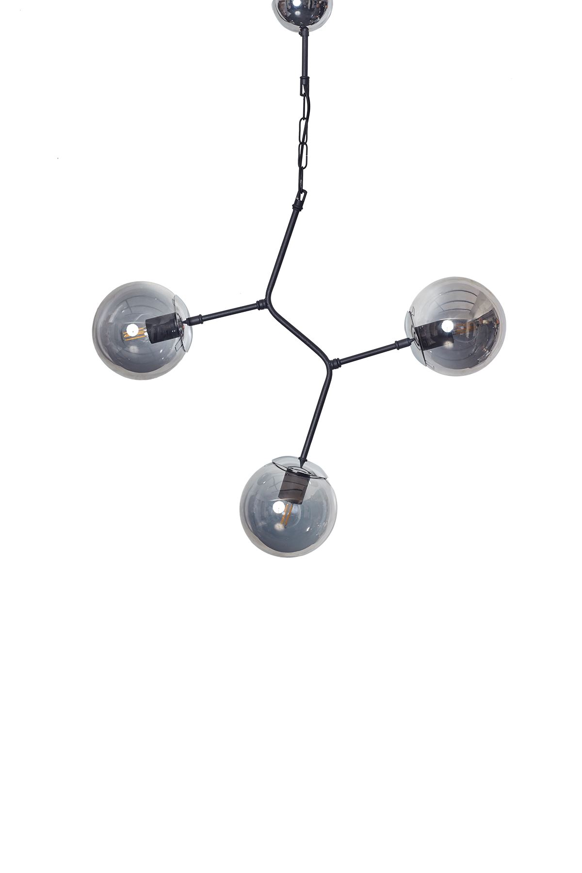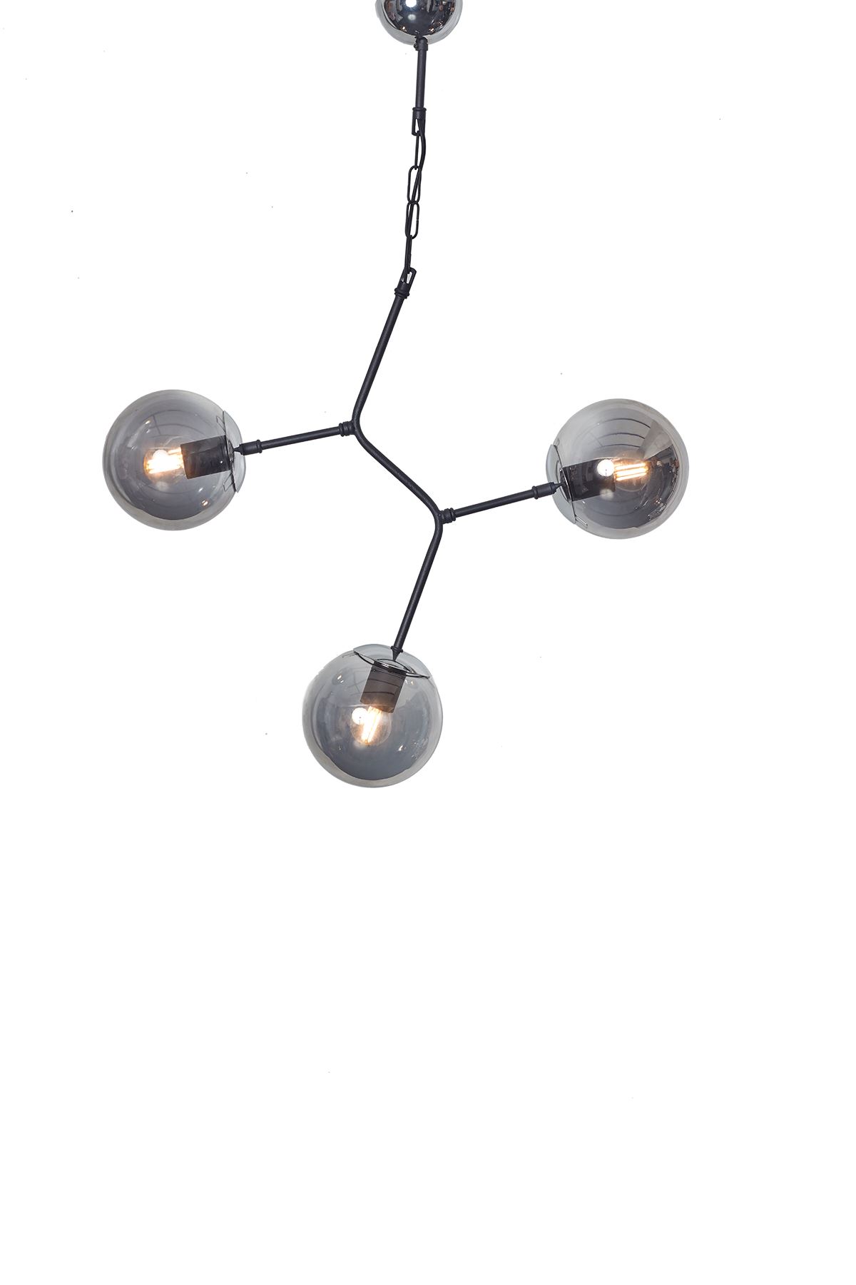 • Parlak krom ve siyah renkli metal gövde. Füme rengi glob camları  ile çok şık ve modern bir üçlü avize modelimizdir. Ev ve yaşam alanları için uygun dekoratif aydınlatma.